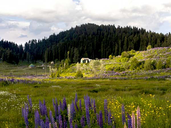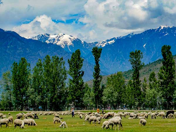 Kashmir, recognized for its striking natural beauty, presents a scene with a picturesque backdrop.